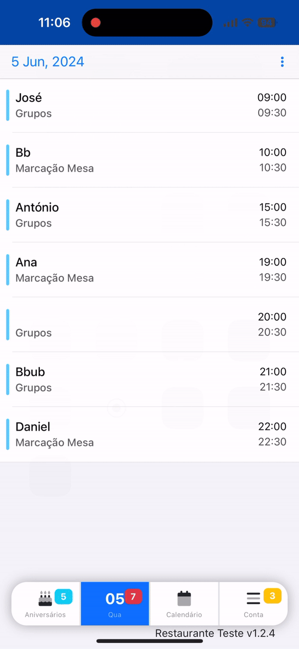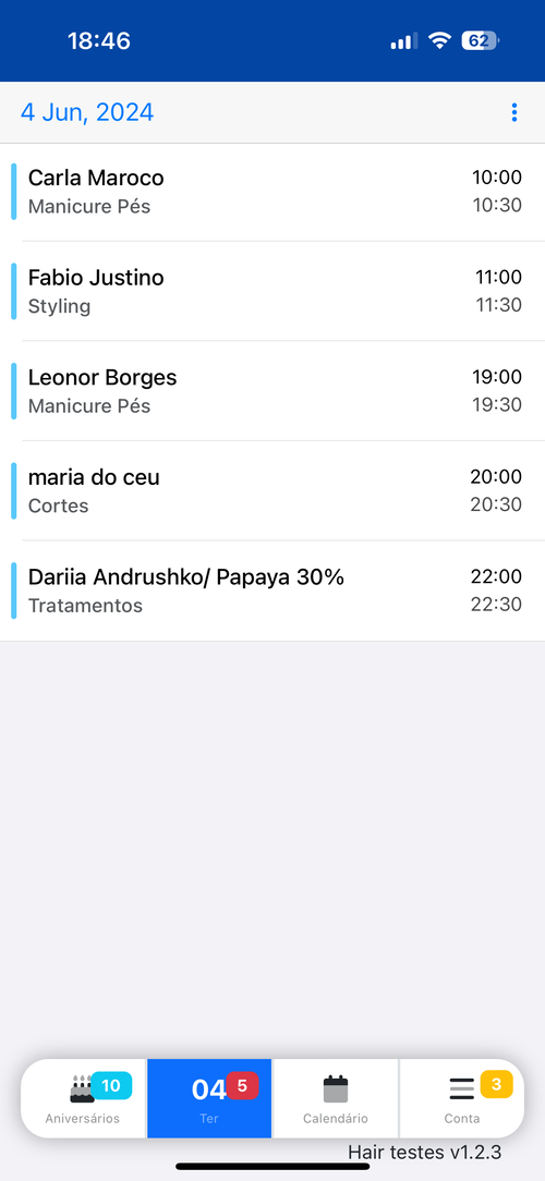Visualiza todas as marcações do dia com detalhes de horário e cliente.